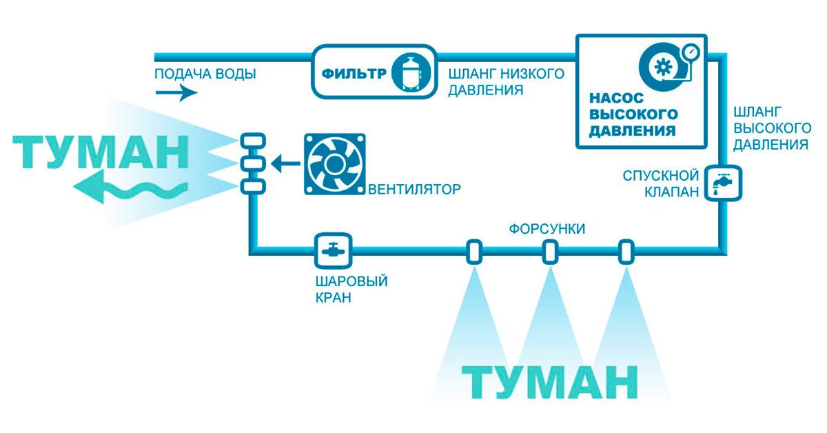 Принцип работы систем тумана прост, очищенная вода агрегатом высокого давления подаётся по магистралям, распыляется через форсунки, а туманная дисперсия, испаряясь, охлаждает и увлажняет окружающую среду. Наиболее эффективно насос высокого давления выполняет свою функцию при семидесяти Атмосферах. Мировым лидером по производству оборудования систем тумана является Technocooling (Италия).